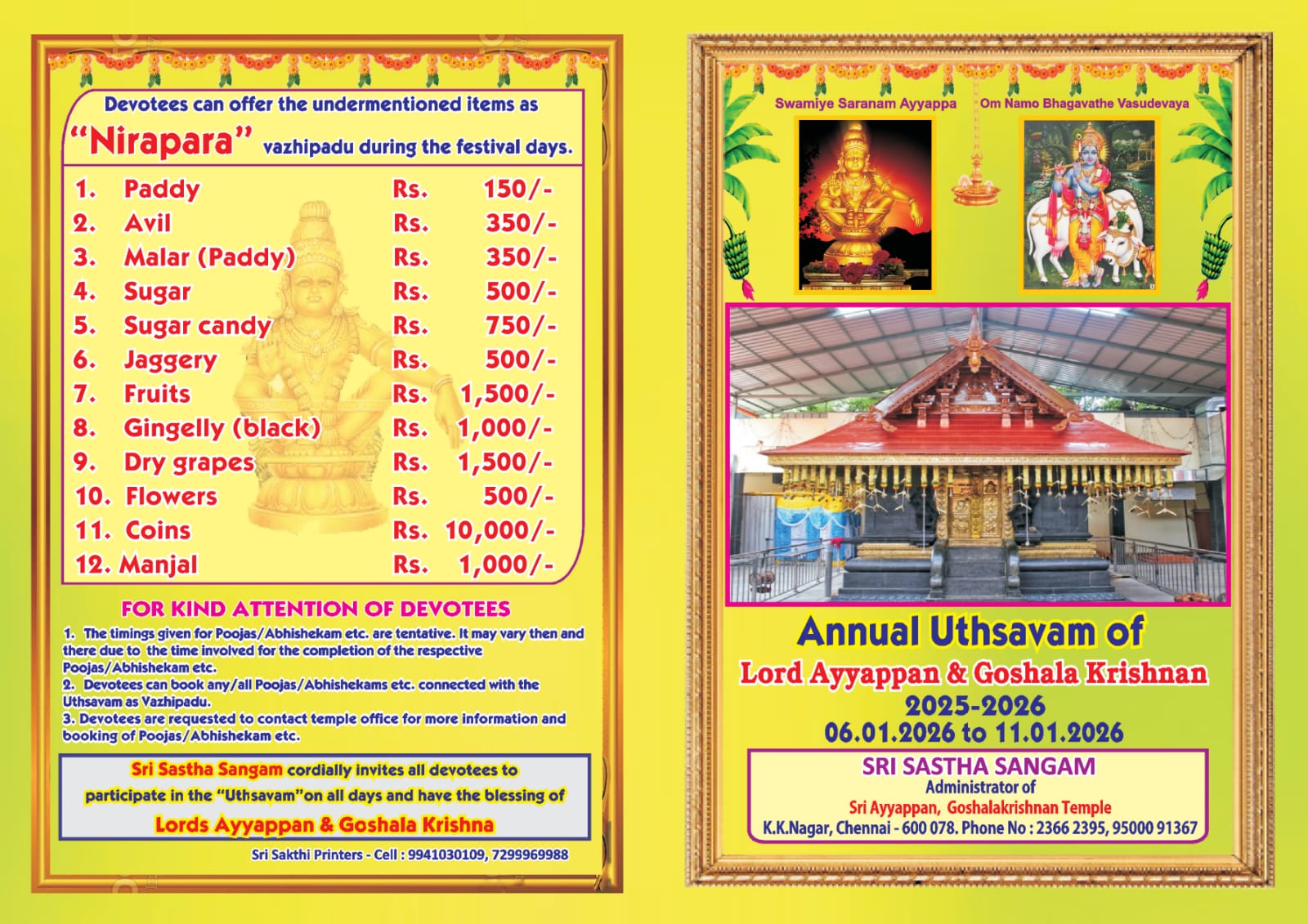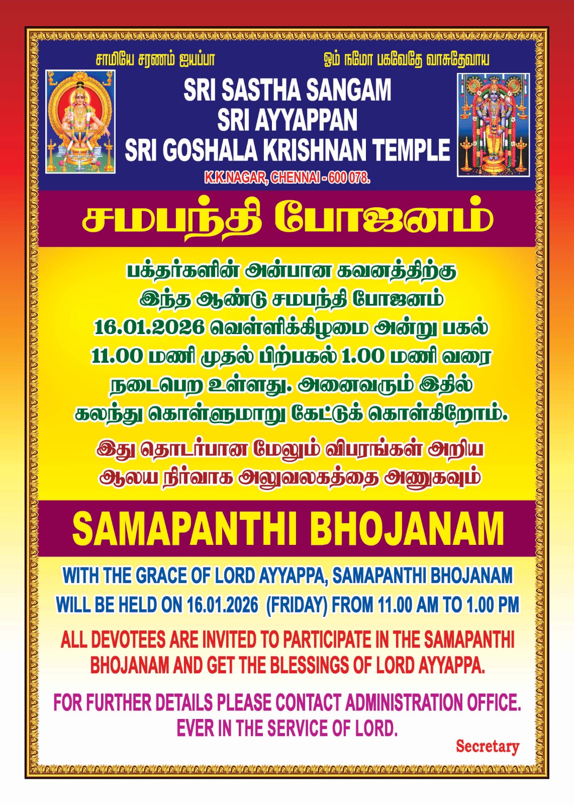 In the year 1977, a few colleagues came together and began a small group to sing bhajans on every Saturday, on Lord Ayyappan Sri Dharma Sastha. This thought, came up at AV Patro Salai, Ashok Nagar, under an electrical transformer. The initial rounds of bhajans took shape, credit goes to Ravivilangan, Mrs. AVR Menon, Mrs. Kuttiamma, Mrs. Bhaskaran Nair, Mrs. Subramanian, daughters of VG Nair, Dileep, Sreedharan who all took active part under the initiative of our founder Mr. J. Gopindran, and C. Govindan Nair.